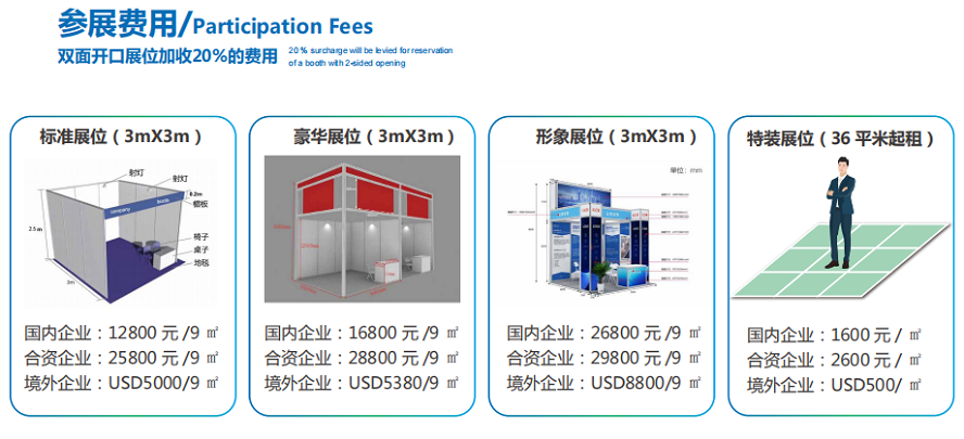 三面围板(3×3×2.5m)、地毯、两盏射灯、一张咨询桌、两把折椅、单项电源插座(5A/220V)、参展单位(中/英文) 楣板一条。